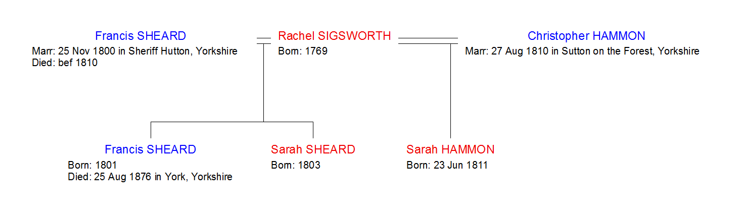 We have recently found a reference for a Sarah SHEARD being christened on 17 July 1803 in Sheriff Hutton, father recorded as Francis SHEARD. As previously mentioned Francis SHEARD married Rachel in Sheriff Hutton, Rachel being “of this parish”, surely it is not unreasonable to assume that Sarah was the second child of Francis & Rachel.